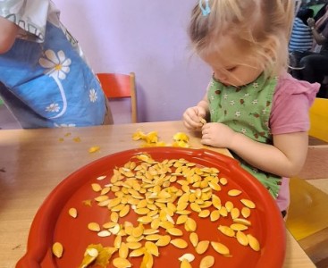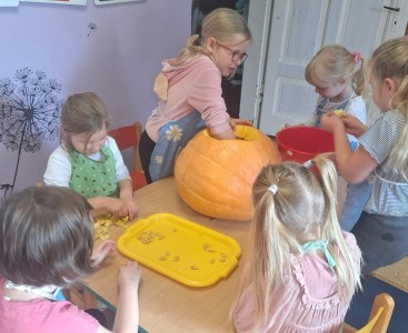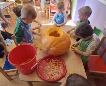 Dzieci miały wyjątkową okazję zajrzeć do wnętrza dyni – wspólnie ją otworzyliśmy, a następnie każdy mógł własnoręcznie wyciągać miąższ i szukać pestek. To była prawdziwa sensoryczna przygoda! Dzieci z ciekawością dotykały, wąchały i obserwowały dyniowe wnętrze, rozwijając przy tym zmysły i zdolności manualne. Pestki zostały później dokładnie oczyszczone i pozostawione do wysuszenia – może wiosną posłużą nam do stworzenia własnej przedszkolnej grządki?