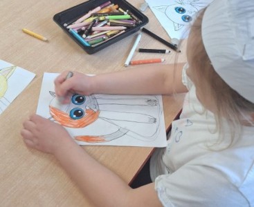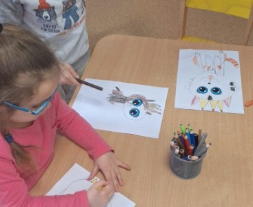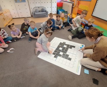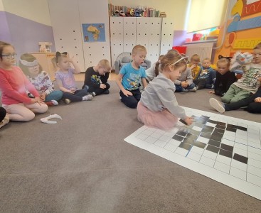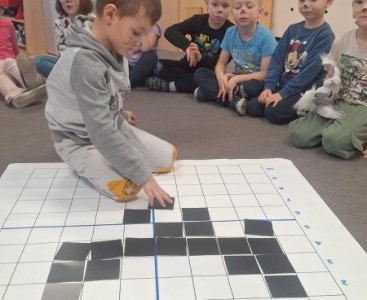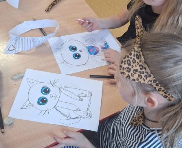 Kolejnym punktem dnia były zajęcia z kodowania, podczas których przedszkolaki rozwijały swoje umiejętności matematyczne oraz logiczne myślenie. Efektem wspólnej pracy był kot ułożony z czarnych kartoników. Nie zabrakło również aktywności plastycznych – dzieci wykonały piękne prace związane z tematyką kotów, wykazując się dużą kreatywnością i zaangażowaniem.Tego dnia przypomnieliśmy sobie także, jak ważne są zwierzęta domowe oraz jak należy o nie dbać.