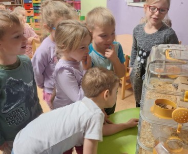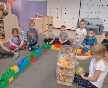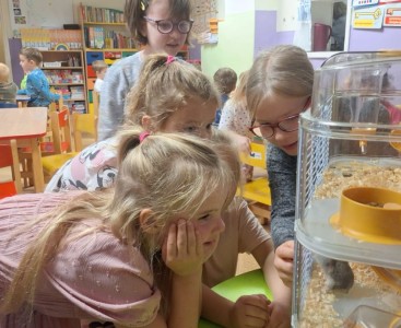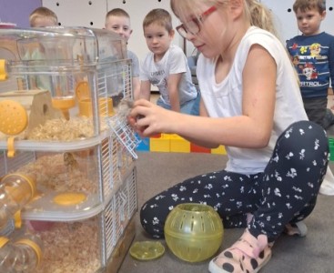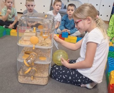 W ramach tygodnia, którego tematem były zwierzęta domowe, w naszym przedszkolu pojawił się wyjątkowy gość – chomik Puszek, należący do Patrycji. Dzieci z ogromnym zainteresowaniem obserwowały małego zwierzaka, zachowując przy tym dużą ostrożność.Patrycja opowiedziała wszystkim, jak wygląda opieka nad chomikiem – czym się żywi, co pije i jakie ma potrzeby. Przedszkolaki dowiedziały się, że posiadanie zwierzątka domowego to nie tylko przyjemność, ale także duża odpowiedzialność. Na zakończenie spotkania dzieci zbudowały dla Puszka plac zabaw z klocków, po którym chomik mógł się bezpiecznie poruszać dzięki specjalnej kuli. Dzień zakończył się kolorowaniem obrazka przedstawiającego chomika – pamiątki po wizycie naszego futrzanego gościa.
