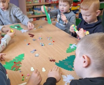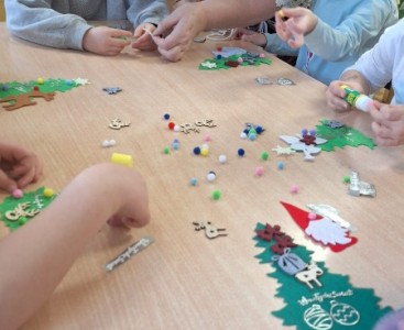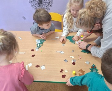 Kolejnym etapem warsztatów było zadanie plastyczne. Dzieci samodzielnie wykonały świąteczne dekoracje w postaci choinek, które ozdabiały różnorodnymi, kolorowymi materiałami.