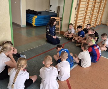 Zajęcia rozpoczęły się od wspólnej dyskusji na temat tego, czym tak naprawdę jest szacunek. Uczniowie dowiedzieli się, że to przede wszystkim traktowanie innych z życzliwością i zrozumieniem – nawet wtedy, gdy mamy odmienne zdanie. Pani pedagog opowiedziała dzieciom inspirującą historię o Kacprze, zapalonym piłkarzu, który musiał nauczyć się, że krzyczenie na kolegów z drużyny nie przynosi dobrych efektów, a prawdziwą siłą sportowca jest umiejętność wspierania innych w trudnych chwilach.