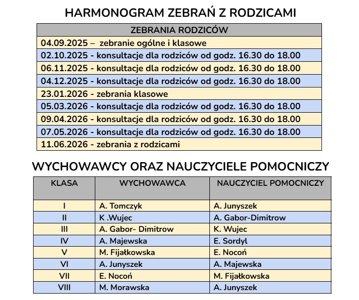 - szczegółowy harmonogram i zakres konsultacji dla uczniów / wychowanków i ich rodziców jest ustalany w każdym roku szkolnym i podawany do wiadomości nauczycieli, uczniów i ich rodziców.